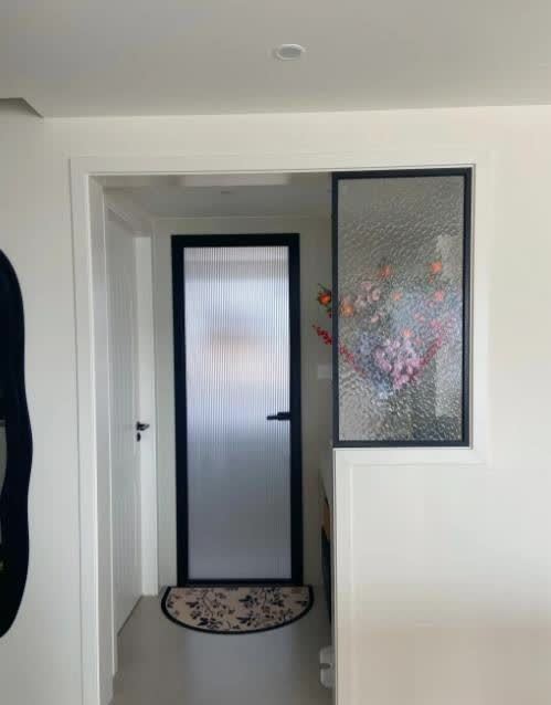 5、半墙设计特别好看,而且还有图为证,但这些照片都是没有使用过的,但真正放在生活中,正常都要用洗手间洗漱,放上那些瓶瓶罐罐,你再看看好不好看?所以边上一定要定制水波纹玻璃隔断,记得尺寸四周各预留3毫米 ,边框选极窄边框 ,安装时安装在半墙外侧,打上螺丝后四周打一圈玻璃胶。