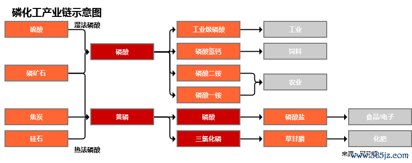 磷化工产业链,上游为原材料磷矿石,用硫酸、硝酸或盐酸分解磷矿制得的磷酸统称为湿法磷酸;以黄磷为原料,经氧化,水化等反应而制取的磷酸称为热法磷酸。中游为含有磷元素的各有机物、无机物,下游为制成的产品,应用于农业、工业等各类行业。